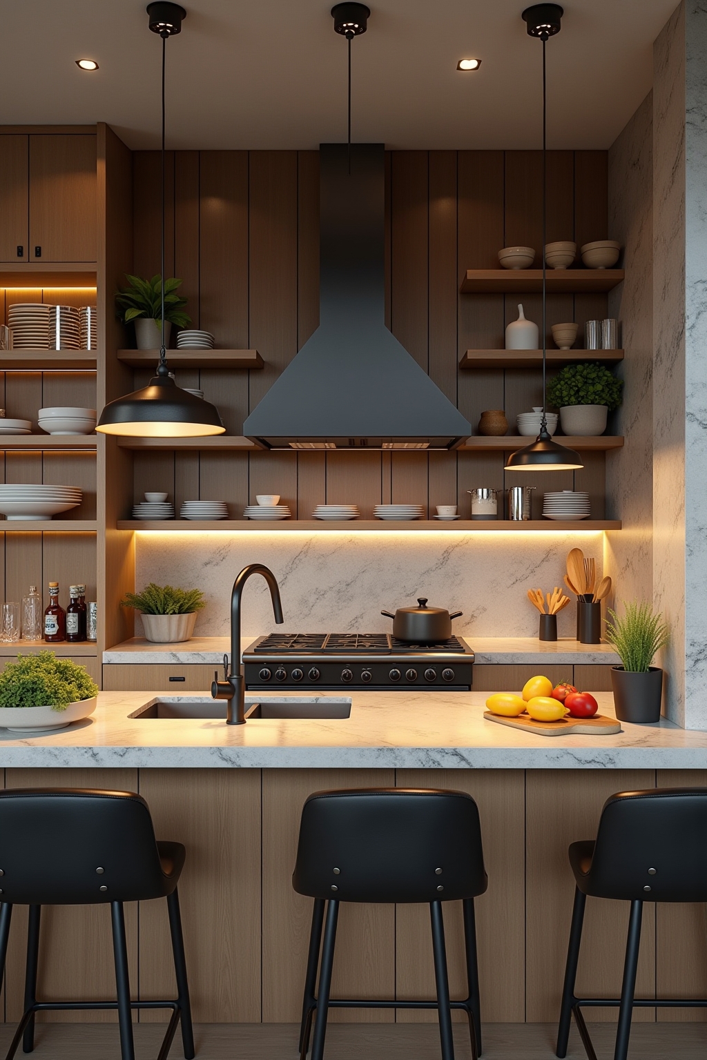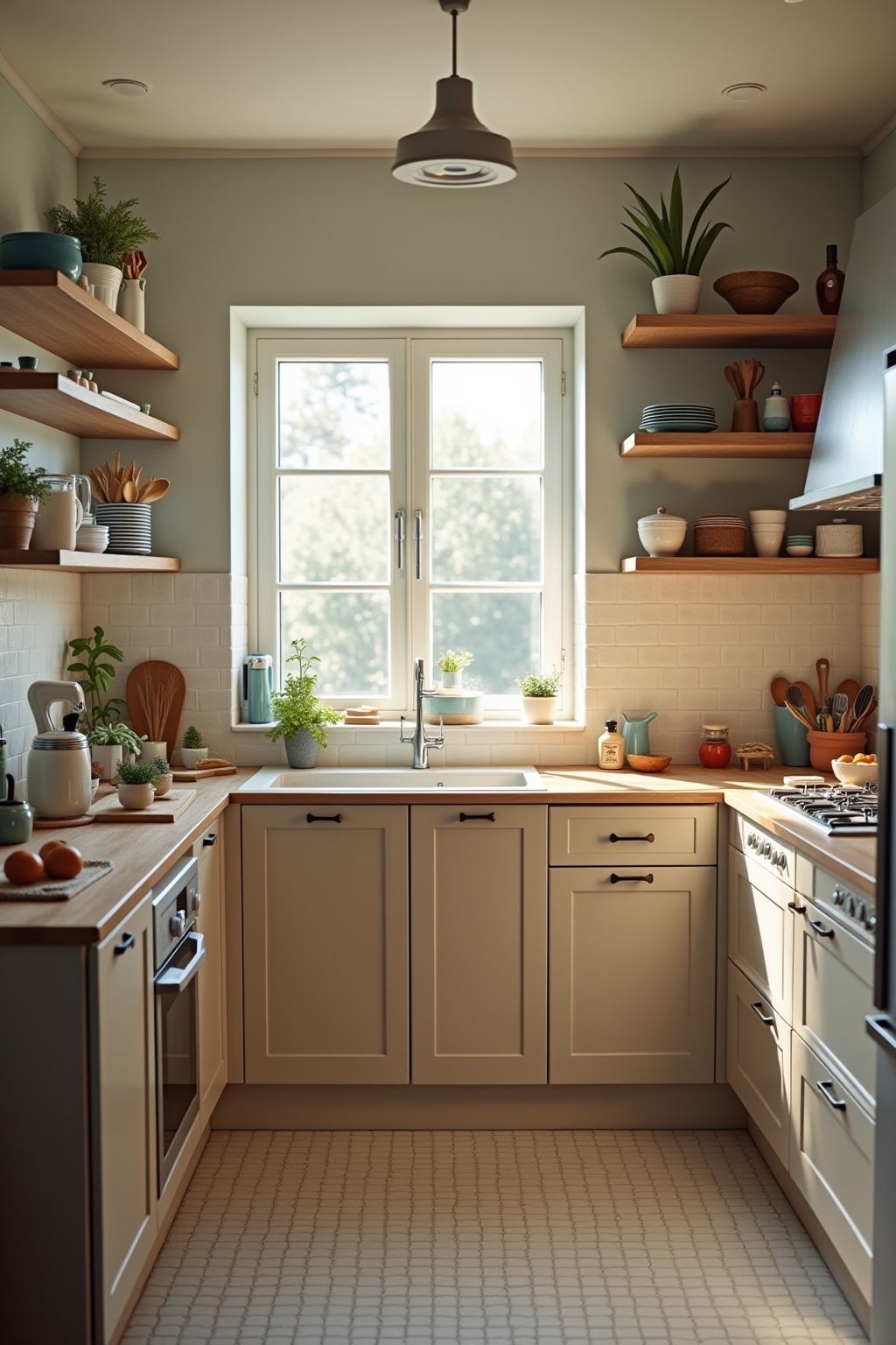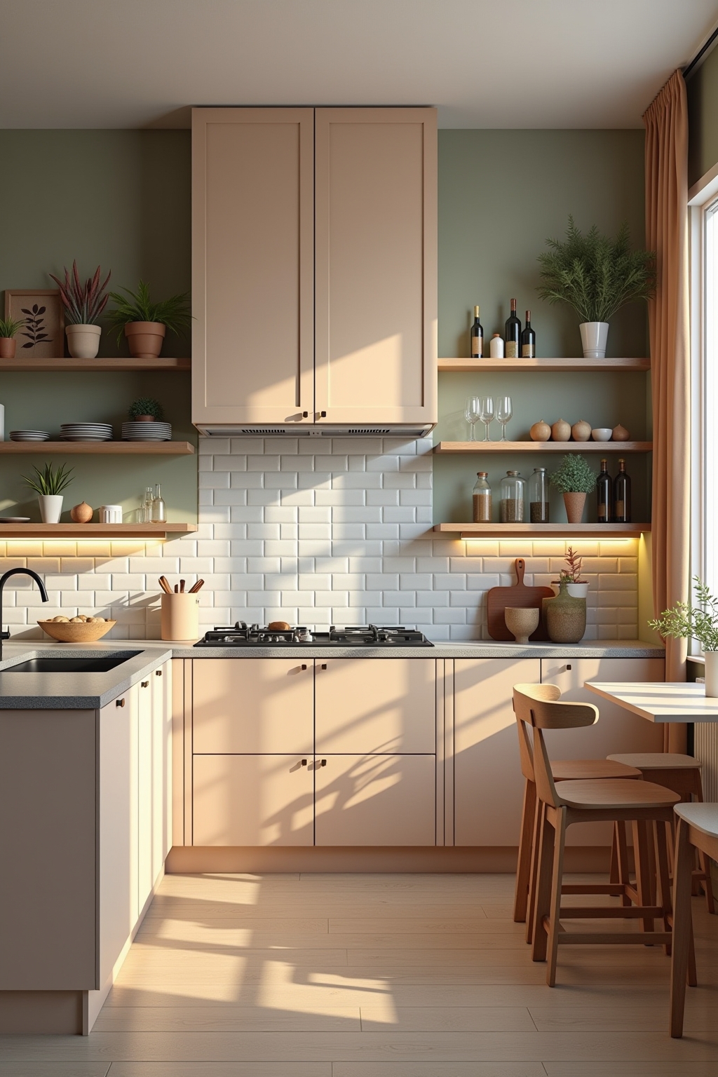 • Offene Regale als kosteneffiziente und moderne Alternative zu Oberschränken.