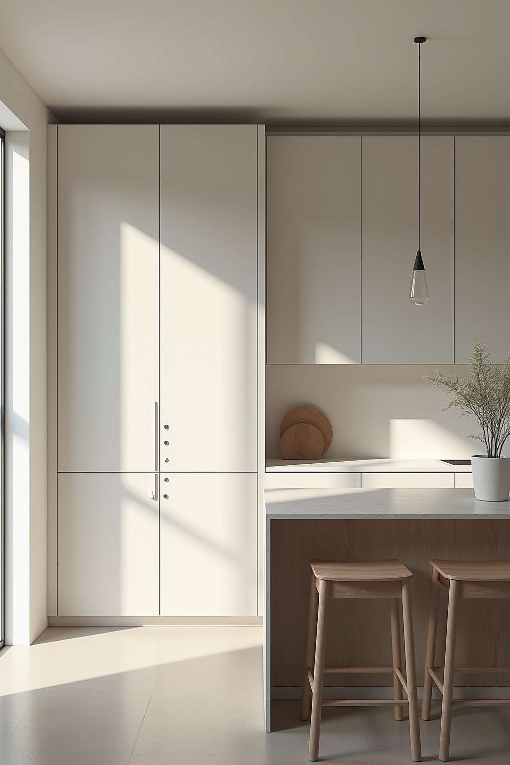 Minimalistische Küchentrends 2025: Klare Linien und reduzierte Formen kombiniert mit versteckten Stauflächen für maximale Funktionalität.