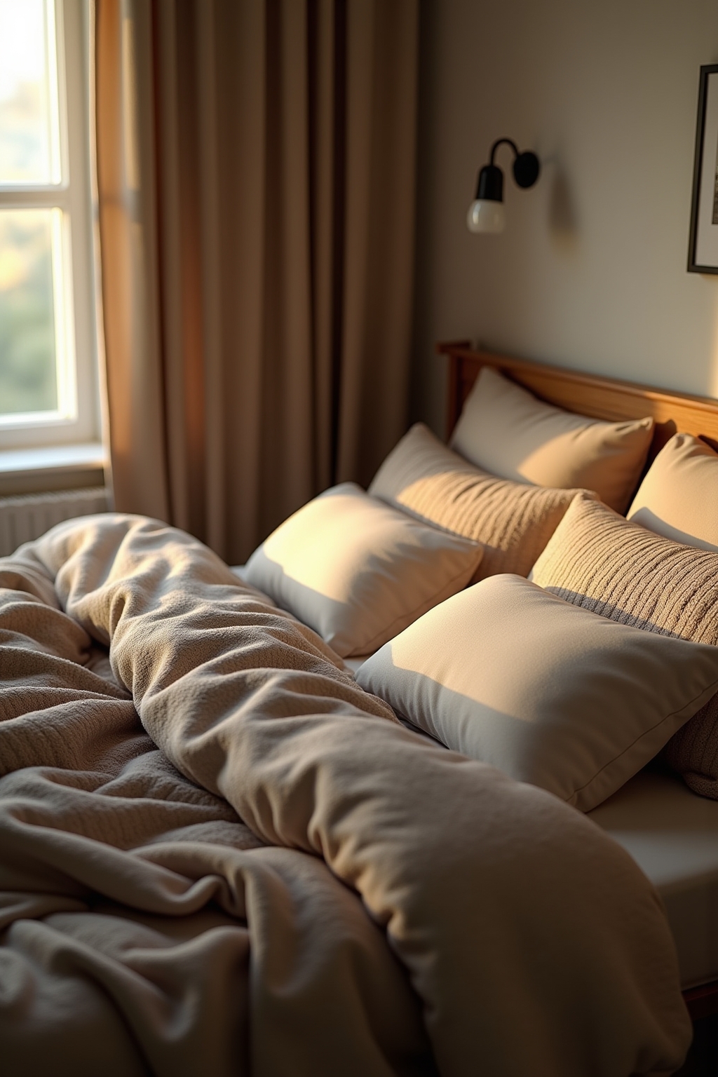 Eine Faustregel für ein harmonisches Schlafzimmerdesign: Kombiniere mindestens drei verschiedene Texturen (z.B. Leinen, Baumwolle, Strick), aber halte dich an maximal zwei bis drei Hauptfarben.