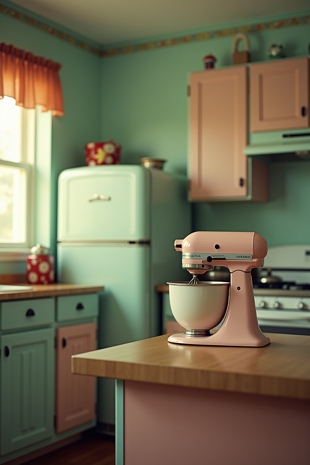 Wichtige Vintage-Küchen Merkmale: Pastellfarben (mintgrün, babyblau, rosa), abgerundete Formen und Chrom-Applikationen charakterisieren den authentischen 50er-Jahre Look.
