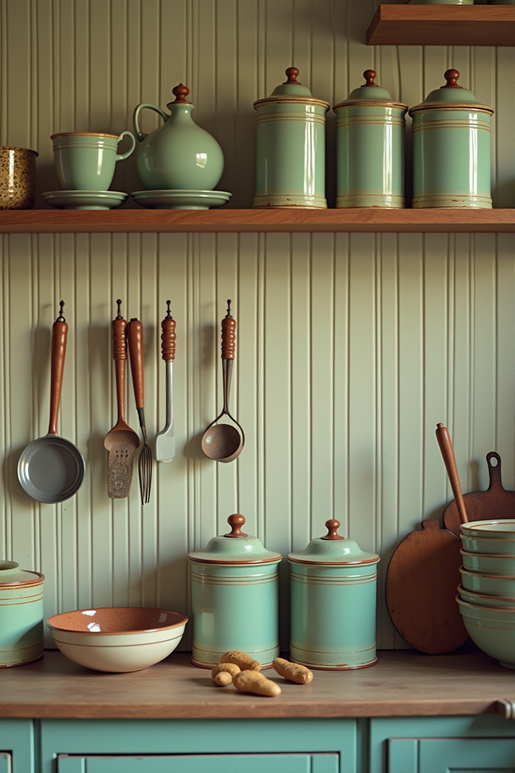 - Authentische Materialien wie Emaille, Keramik und Gusseisen für Küchenutensilien und Accessoires verwenden