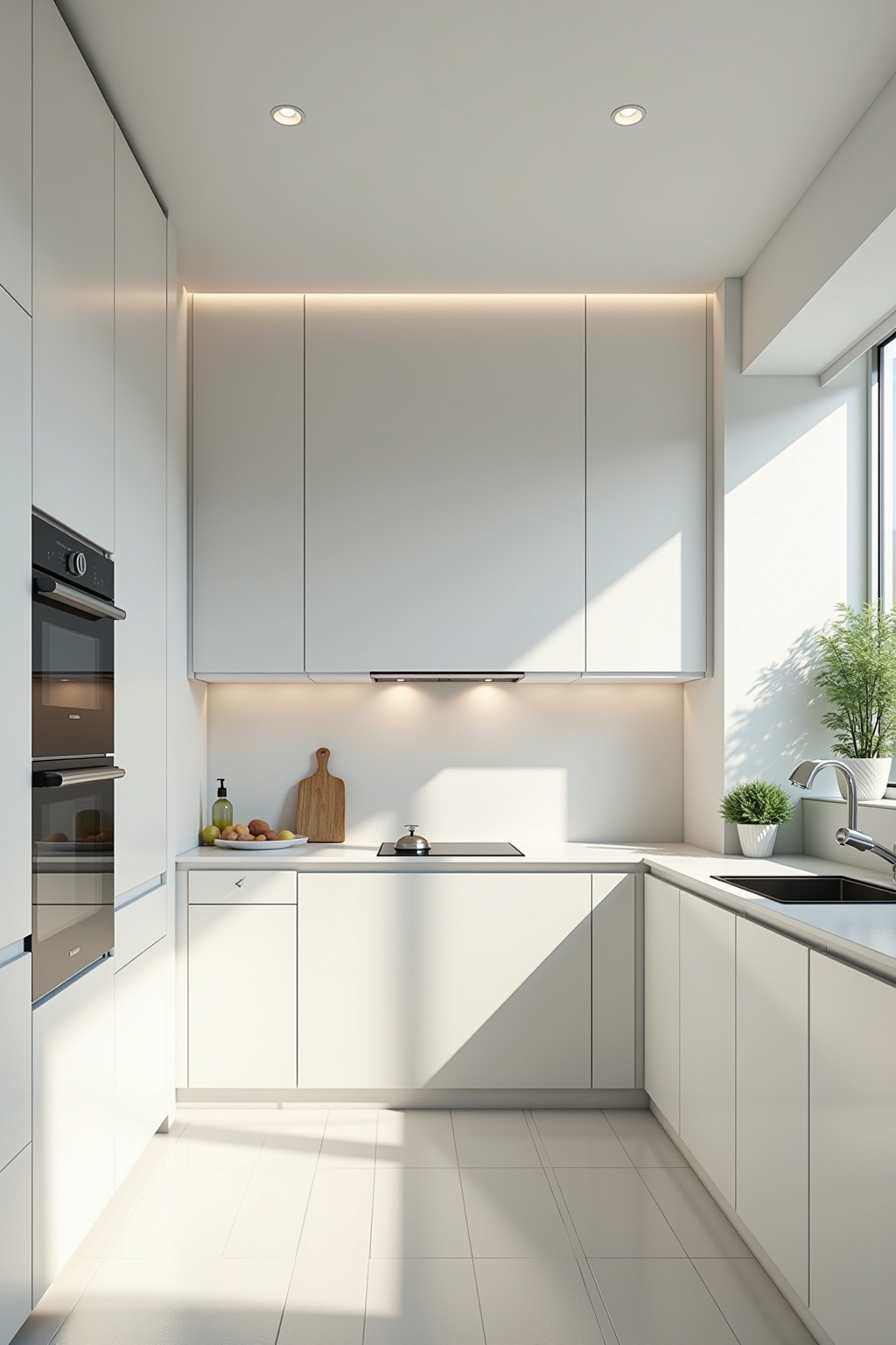 Warmweiße Lichtquellen (2700-3000K) lassen weiße Küchenflächen angenehm strahlen, ohne kühl zu wirken.
