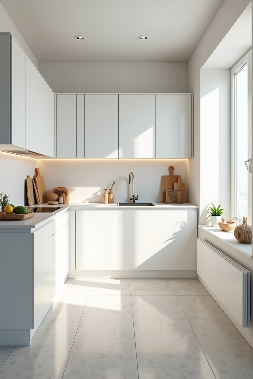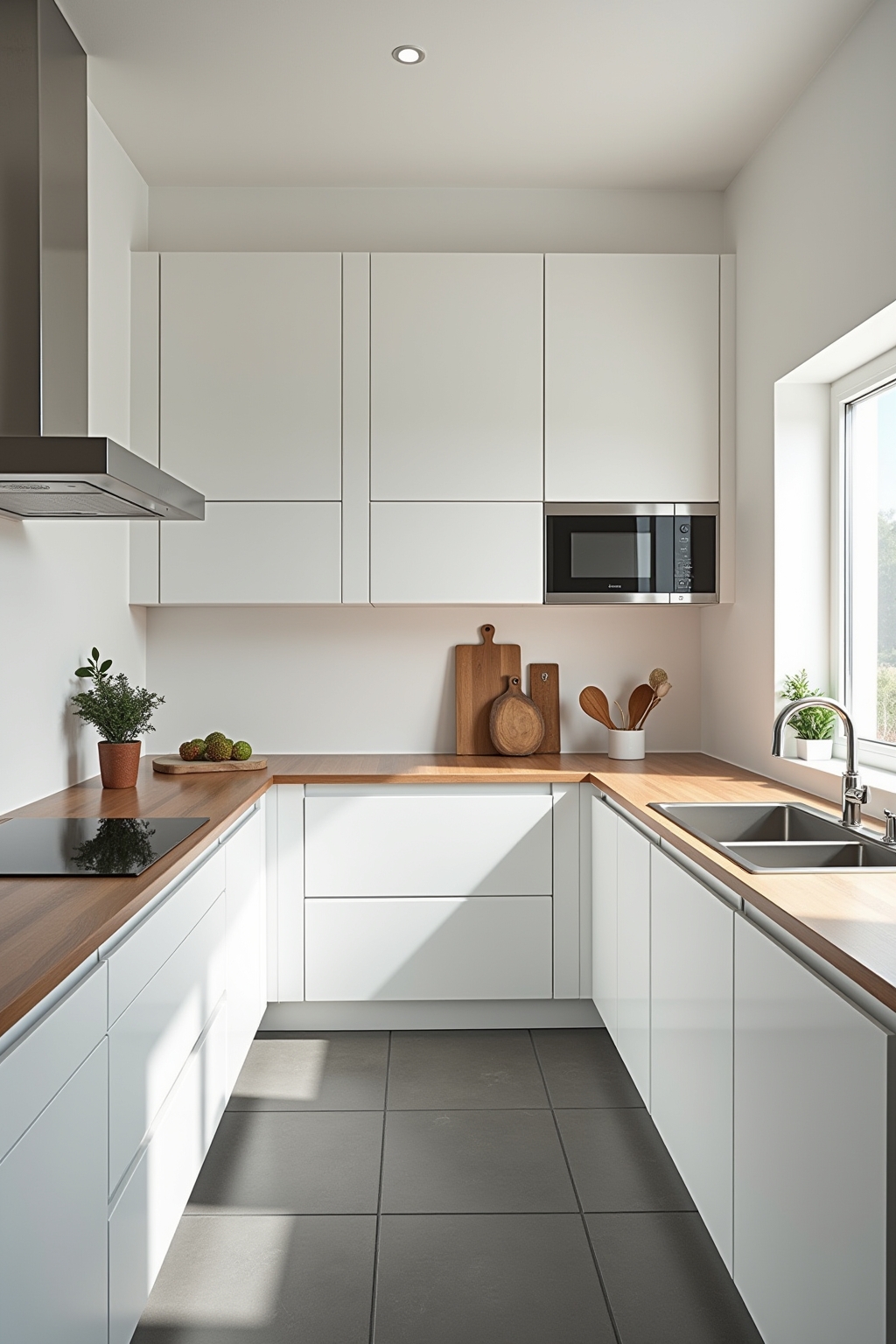 • Naturmaterialien wie Holz oder Stein schaffen einen warmen Kontrast zu weißen Küchenfronten