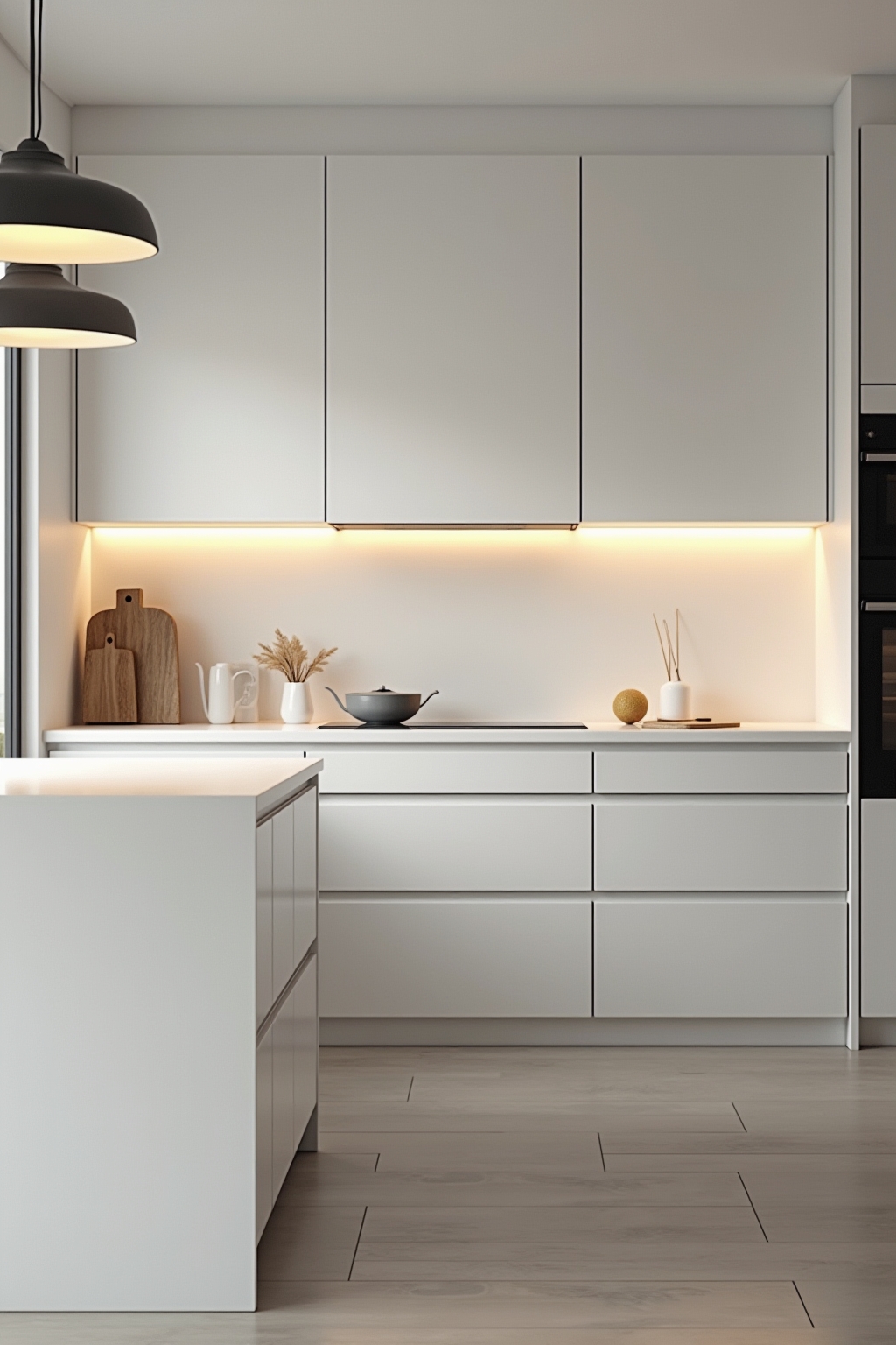 Kombination aus funktionalem Arbeitslicht und dekorativen Lichtakzenten schafft Atmosphäre und verhindert den „Laboreffekt“ in weißen Küchen.